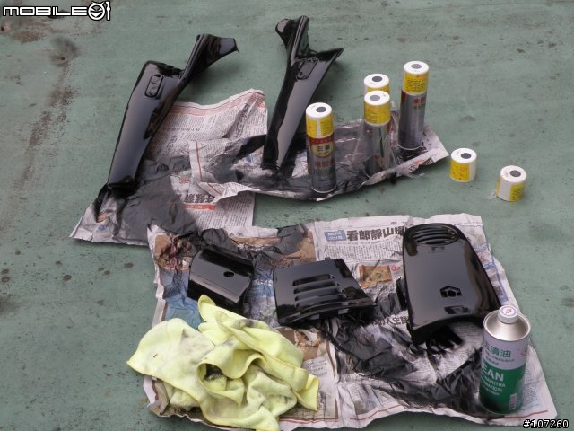 1.前處理:將所有欲噴的車殼拆下並清除貼紙,再來用洗衣粉清洗,清洗完後使用400號已上砂紙研磨至自己滿意
