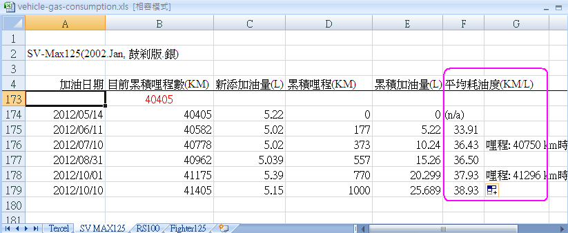 夜尋左 wrote: 想請教各位現在新車的油耗會這麼誇張嗎0.0?? 如果可以的話可以順便PO各位的油耗參考看看...(恕刪)(SV-Max125, 2012/10/10 updated)