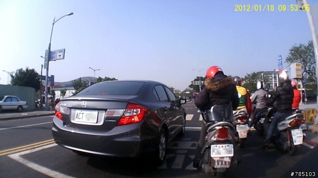 Night Rin wrote:因為停等區常常有這種白癡(看的出來是新車,還是今年的新大牌;為了祝賀他牽新車,於是我就把這張截圖寄給交通隊讓車主見紅大喜了) 這張的機車騎士還都真守規矩,值得嘉許,路口停得乾乾淨淨感覺真好,那台車真的是很礙眼!