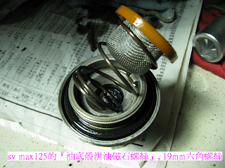由此觀之, 自己這台 2002年份汗血寶馬車車(sv max125) 的引擎要持續搭配『油底殼泄油磁石螺絲』, 較能讓此台車車延年益壽!