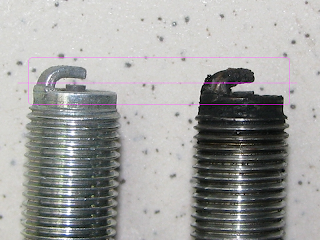前一顆火星塞是NGK依合金材換不到3個月就報銷了,後來想想怪怪的,騎到常去的車行問問。