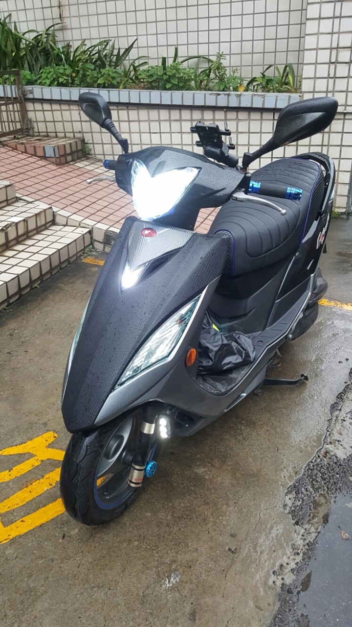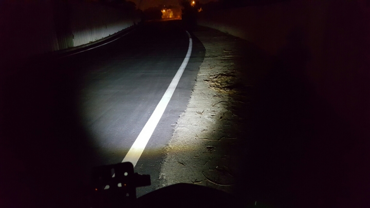 常常走鄉間小路和沒路燈的山區道路原廠的大燈覺得不夠亮:亮度不平均而且照射範圍窄因此看到貓瞳LED就很心動於是就買了一顆安裝在左邊的馬表支架上:燈全開之後待速電壓約13.2僅開輔助燈:全黑路段:僅開貓瞳LED輔助燈:輔助燈+大燈:輔助燈+遠燈:切線明顯白天可以當日行燈晚上當輔助燈有裝獨立開關可以開啟或關閉切線往地板照,對方不會感到刺眼耗電量低