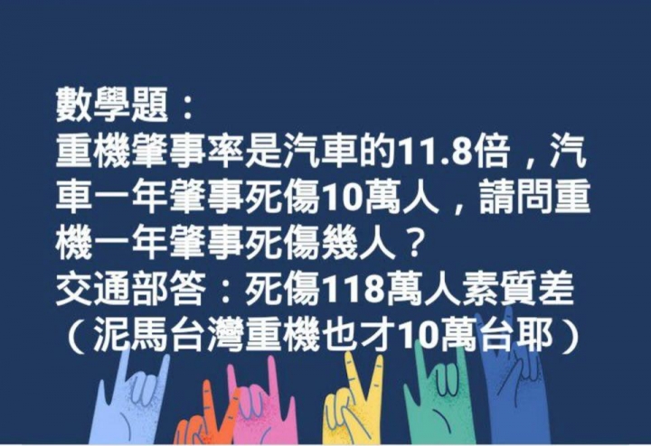 tansywen wrote: 你知道台灣肇事率比例最低的車種是哪種嗎?是小綿羊耶~小綿羊肇事率全台最低,還是不能上國道啊。 又不是說肇事率低就可以上國道而是上國道肇事率要低就像有讀書不一定考得上好學校但要考上好學校一定要有讀書同樣的道理