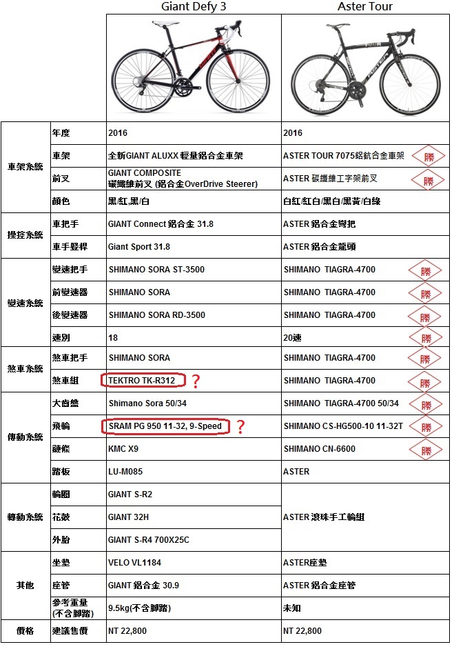 sora或是tiagra其實沒差那麼多啦剛開始我也會覺得sora很差 蟑螂鬚很醜但現在用過red ultigra套件 反而覺得sora也不會差也是很順 檔位也很確實 雙軸夾器效能也滿好 蟑螂鬚也是讓變速很順的特點之一個人認為新一代sora變速 不會輸給上一代的105至於車架品牌aster頭管還是比較短 後叉也比較短 上管比較平 無疑是比defy更適合競速還有最重要的車架作工 液壓管的細緻度 打磨與考漆品質 本土能跟giant拼的不多講到前面提的貨架孔 簡而言之偏旅行用途的車比較會出現貨架孔假設拿競速幾何硬上貨架 假設掛10公斤貨物 短後叉短軸距會讓車體更難平衡去看giant escape 旅行車的後叉就超長 載貨物會穩很多我印象中的數據tcr軸距 99defy軸距 101escape軸距 107