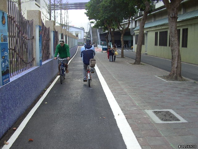 台大門口羅斯福路口多了一條自行車穿越專越道標線,彰顯腳踏車路權。只有跨馬路功能。穿越公館夜市到自來水博物館新作的圍牆邊單車道還沒解決。但對新店溪河濱腳踏車道車友跨越羅斯福路銜接破破爛爛的台大-大安森林公園的市區腳踏車道的幫助已經很大了。希望台北市政府在景美舊橋-景美溪橋的路面腳踏專用道標示也採用這種方式。自來水博物館人行道旁新作的腳踏車道。跟前面的跨羅斯福路的腳踏車道怎麼連結呢?