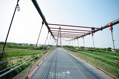 這座前身為蔗糖廠的舊鐵道,廢棄後被改建規劃為連結朴子溪兩岸的觀光單車吊橋。騎上去後景色遼闊,全用鋼纜鐵網所建造的輕量鏤空結構,讓我直到騎至橋中央,才訝然發現,原來自己腳下踩的車輪正在高高的溪流上空飛天而過。真是驚到好過癮!