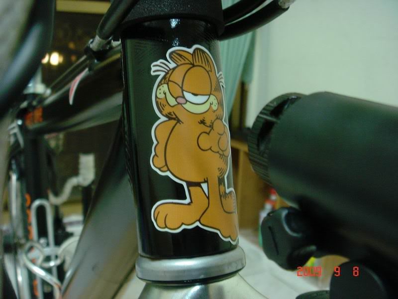 之前無聊亂搞~把車子換色~搞好後~就把原本在頭碗處的G(iant)牌拿掉~換成了G(arfield)牌~然後無聊~又在上管處貼了一張~我只覺得~只要我開心我爽就好了~在怎麼亂搞也是我的車~也因為車子不是很好~所以努力把他搞的更像菜籃車~出門也可以比較放心~