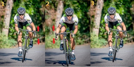 打算深入了解抽車技巧,就得先了解什麼是抽車抽車,是一種利用反向拉扯手把,追加踩踏力量的技巧補圖上圖1,右腳已經踩到底,準備換成左腳踩這時候按照箭頭的方向,在左腳踩踏同時將左手把往上拉,然後成為上圖2的動作上圖2,跟上面情況相同,左腳已經踩到底,準備換成右腳踩這時候按照箭頭的方向,在右腳踩踏同時將右手把往上拉,然後成為上圖3的動作---------以上,這就是所謂的利用反向拉扯手把,追加踩踏力量抽車這種技巧跟站姿沒有半毛錢關係,大家都站著抽,是因為站著比較好抽而已坐著抽車也可以,並且實際上世界三大賽選手也是有人坐著抽車衝線的你們自個兒上網找影片,衝線時坐著抓住下把,把車晃得跟雙刀火雞姐似的,就是坐姿抽車這樣不好出力,但風阻比較小站著騎不拉扯手把,就只是單純的站立騎乘,不是抽車只是左右晃車子,而不是在踩踏時反向拉扯手把,也不是抽車抽車拉扯時的左右晃動主要有兩種功能其一,這是一種動態平衡技巧,你也可以控制住車子盡量不晃動,但受到手部拉扯手把的影響,車子的平衡反而會因此不穩定其二,適當的左右晃動可以加速踏頻,因為這動作本就跟踩踏動作反向,你的拉扯動作會形成反向施力,讓手把加速與踏板遠離※另外還有一個次要功能,有些職業選手會故意放大抽車動作來干擾其他選手,甚至使出暗拐肘擊左一,傳說中的暗拐,過來就死至於抽車晃動幅度一般來說是讓身體自然反應就好,刻意的縮小或放大幅度都會影響踩踏不過較小的動作會減少能量損耗,較前傾並且低頭則會讓風阻減小,這些可以靠練習來適應