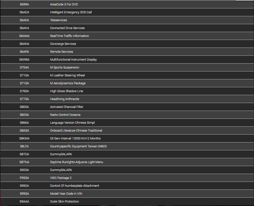 請問有人有在網路上查過自己的 BMW VIN 號碼嗎?我查了一下我的VIN, 我的車子是有配 Harman Kardon 兩支高音喇叭, 但是查VIN號碼後發現好像沒有列出這項出來。我在想是否是總代理自己在台灣加裝而不是一開始就從工廠出來?有人也跟我一樣查不到嗎?這是我查詢的網站: https://www.mdecoder.com/以下是我的選配資料, 但就是不知道哪一項是Harman Kardon 音響, 有高人可以指點嗎?謝謝大家~