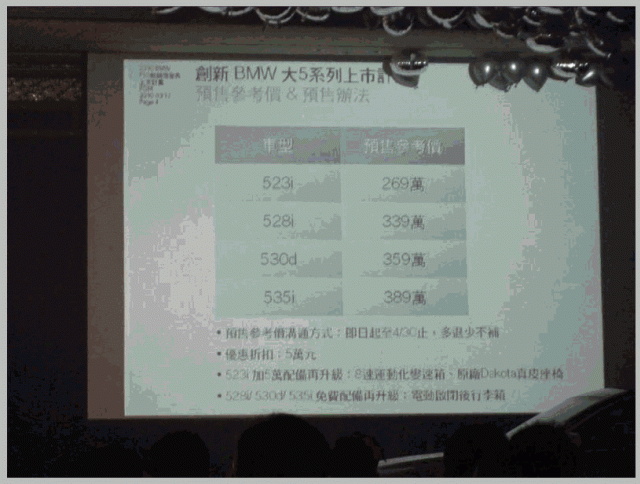 新大五的銷售方式。下片四排字有點模糊,所以我打上來,大家看比較清楚。*預售參考價格溝通方式:即日起至4/30止,多退少不補。*優惠折扣:5萬元。*523i加5萬配備再升級:8速運動化變速箱、原廠Dakota真皮座椅。*528i/530d/535i免費配備再升級:電動啟閉後行李箱。這些都是總公司釋出的福利,並不是業代本身給你的。預祝大家購車愉快,希望有幫助到大家。