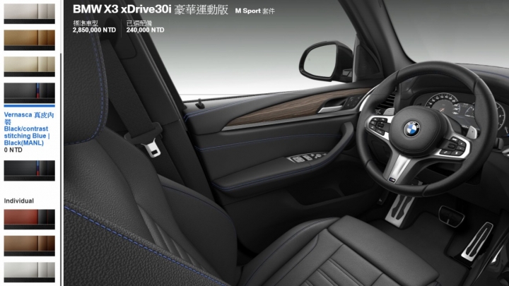 蒼天 wrote:X3、X4真的是很...(恕刪) 真的~回到現實面、可能會妥協於面面俱到的X3 不過、心中的惡魔又想到X3 & X4的折衷方案 :就是X3豪華運動版改德訂: Msport套餐(藍色車縫線內裝 + M款方向盤 + M煞車 + M懸吊)但、這追加的24萬,或許可以彌補日後在路上遇到X4 30i Msport時...不須小小嘆息唄...泛德6月的方案、豪華運動版已標配"全景天窗(比X4大) + Carplay",售價則是調整為289萬加上德訂的24萬、再小刀一下...應該也是接近300了Msport的外觀還是比較動感:M包 + M圈 + M卡鉗 有全景天窗、黑色的M內裝天篷就不會有太重的壓迫感了 我喜歡這個下巴藍色縫線的皮椅+門飾板...這只有X4引進的首批才有、M方向盤+金屬踏板+木紋飾板,一整個質感大提升