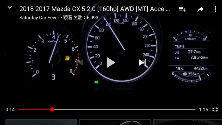 ??CX-5 2.0na應該不太可能10秒內~看影片應該是從3秒時起步,到14秒才觸100(錶速),實際應就落在11-12秒算是合乎它的車重比!至於2.2D 的0-100水準,查得數據是 9.4 秒,SUV畢竟是休旅性質又有車高因素(同引擎轎式馬6則可到 8.4 秒),以此級別看也算是可接受了!kuobba003 wrote:CX-5 汽油版是 ...(恕刪)