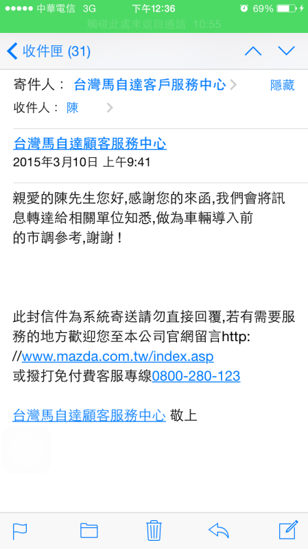 tayajason wrote:已集氣+1... watch7learn wrote:贊成大大的看法這兩... chuangson wrote:我也是個準買主之一... Mazda客服已經回信,希望真的能傳達成功,也請各位能一起支持持續接力aron.yang wrote:你們可以組團湊單付...(恕刪) 感謝大大的建議,請問是到展間詢問菜單後,付訂金並於訂單註明2015年式如無MRCC&SBS此兩套系統將退訂嗎?這樣可以給MAZDA作為導入前的參考依據嗎? 於法律上具備效應嗎?如果有效,敝人當然願意付出實際行動!