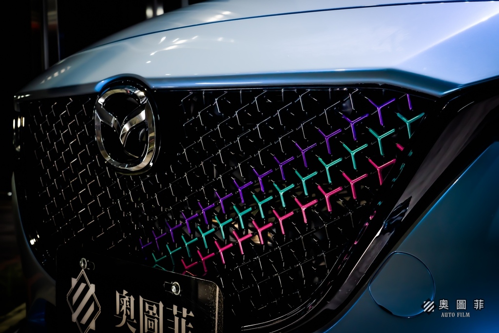 這金屬藍色澤、流暢線條,完全看不出汽車包膜的痕跡,還有這光彩動人的魚眼!對,沒錯,我這次也改了車燈,後面再放影片給大家看看燈光效果,先來繼續看這充滿未來科技感的MAZDA