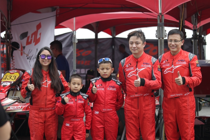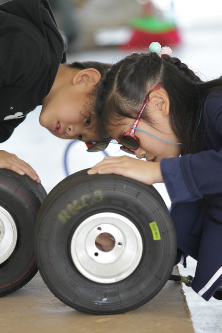 到的時候前一位小朋友剛好測試完,評鑑者是龔葳宜(Kiki Kung),羅賓的大女兒,本身也是賽車手跟教練,先跟包子講解競技卡丁車的基本構造,接下來坐上位置調整車的設定,由於不是自己的車而且來測試的小朋友身材不盡相同,所以用一些隨手可取得的物品調整坐姿,由於包子只有一百二十公分左右,坐姿往前後腳離油門踏板還是太遠,教練用延長桿解決這個問題。
