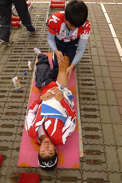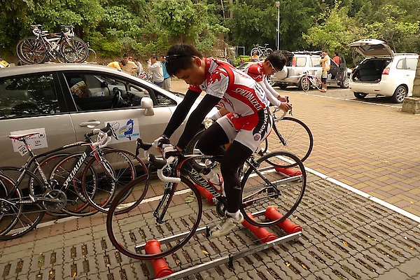 第二站結束之後蠻多車隊的選手都累攤了,韓國人蔘車隊(以前的梅丹本鋪)的隊長福島晉一昨天也累得敗退下來,賽後他表示他前陣子斷過鎖骨,才剛剛恢復,體力調配還不太理想。而彰化站一開始又是累死人的爬坡路段,著名中部路線 “139” 就是環台賽的部份賽段,今早一起床就發現氣溫驟降,選手們在出發點也拿出滾筒訓練台,按摩師則在旁邊幫小朱按摩一下,畢竟一開始就要爬坡,對選手來說體能的負擔很大。不知道為何今天早上就覺得比較趕,車隊都介紹不完就準備要比賽了,登山路段補給特別重要,選手很可能一下山就渴的半死,水和Power Gel都要趕快準備好。
