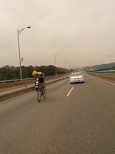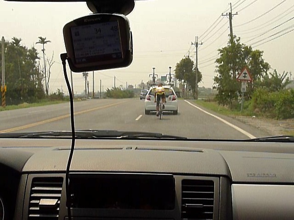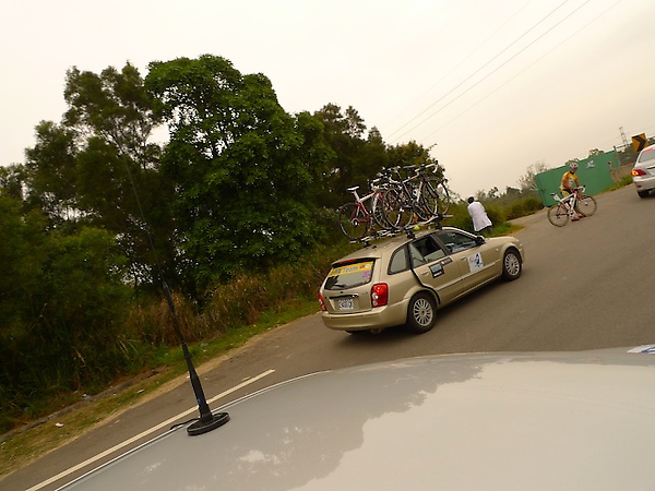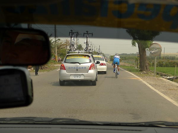 無線電傳來馮俊凱拿下KOM登山點,雖然屬不同隊,不過也為他感到十分高興。今天小狀況比較多,破胎、摔車和機械故障頻傳,這其實和選手的疲勞程度有關,一旦閃神,很容易就會發生意外,車隊今天前面的小朱和阿貴似乎都不太需要人擔心,身上背的補給足夠,反而是嘉宏和安龍又再度落隊下來,初次參加環台賽的安龍狀況似乎不是很好,大概是剛才無情TT之旅耗盡了他的體力,又再度掉到隊車之外,嘉宏則是在隊車與主集團中掙扎,不過他經驗比較豐富,懂得在適當的時機省力並調整身體狀況。