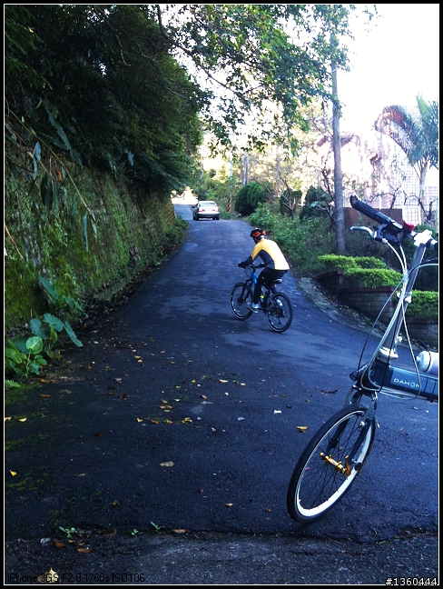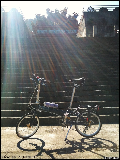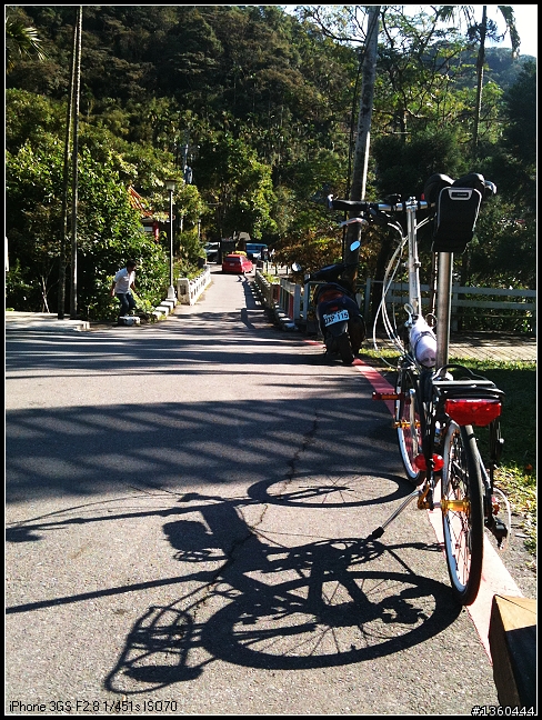 今天來去開發半日遊新路線,以輕鬆休閑騎為主,其實也是因為膝蓋不太行了。星期三承天襌寺兩上兩下,膝蓋痛了兩天,星期六又去兩上兩下,還是痛。昨晚在想是不是該買台27速登山車還是平把30速公路車,齒比輕一點不知會不會改善膝蓋痛的情況。結果晚上睡的很不好,所以今天08:50才從板橋出發,09:07從永寧捷運站1號出口往今天的目的地三峽「皇后鎮森林」前進。沿著台3線左轉進橫溪,經過辭修高中到達竹崙,一路去程大約都是這種很緩的坡,沒什麼感覺。(回程時可以很舒服的滑到台3線,速度也不快)橫溪到竹崙之間在左手邊有兩家小七,補給不是問題。到這裡距離預定目的地「皇后鎮森林」只有1K。09:57到了,離永寧站正好50分鐘,中間還停下來拍了很多照片,一點也不會累。大門口過了橋就要收入園費了,就是那部紅色汽車的地方。在橋上拍一下餐廳的遠景,右邊有部風車,太遠了看不清楚。如果在這裡坐下來LDS也不錯,而且中午前一定趕的回去,不過為了想要運動的車友著想,必須再開發加碼路線。路線一是順路直上「熊空休閒農場」,這也是今天山羚羊的路線,不過事前有做功課,要爬升700多公尺,太操了,也不確定還有多遠。路線二是往回走再左轉到「紫微森林」,看指示牌只有4K。(事後想想4K應該是直線距離,而且回家後爬文,消逝的浮雲寫說:三峽境內山區不乏優質爬坡路線,例如一路緩坡適合山路入門的「滿月圓」;難度中等的首推熊空休閒農場,不過癮的可以續攤加碼爬坡難度更高的紫薇森林、鳶山、李山神宮、佛山寺‧‧‧‧‧‧著名的紫薇森林(北部三大陡坡之一)‧‧‧)騎了2K左右,運動路線出現,先停在路邊喘一下。這根本是殺人坡,再繼續喘。終於騎上紫微天后宮了,神光普照在小摺身上。回首來時路,路,你有看到路嗎?停車場的行動咖啡車,如果只到這裡也不錯,視野很好,半日遊也來得及。想想「紫微森林」應該快到了,再騎吧!傻傻的沒注意到一路只剩登山車,半台公路車也沒有。哇!好像爬得蠻高的了。又繼續騎了一段,11點,半日遊趕不回去了,往山上看依然不見「紫微森林」的蹤影。而且騎上去還不知怎麼騎下來,我後來是半騎半牽回到天后宮的,輪框被剎車磨到慘不忍睹。回程在出了竹崙橋的小七補充一下體力,緩下坡也沒再拍照,很快就回到永寧捷運站,時間是12:10,來回剛好3小時。試算半日遊行程大約是早上8點永寧捷運站集合,可以先到紫微天后宮(或者白雞行修宮,似乎比較不操),應該可在9點半到達,休息看風景後再下到皇后鎮森林,過了10點應該開門了,不進去坐的話11點左右就回到永寧捷運站集合了。
