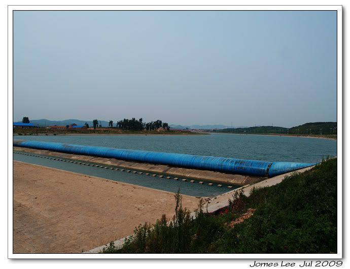 就我所知, 那個藍色水管, 應該是 "橡皮壩攔河堰",相片中看到的是充氣時的樣子, 藉以抬高水位以利引水之作用!!百度知識http://baike.baidu.com/view/50749.html台灣經濟部水利署http://www.wra.gov.tw/ct.asp?xItem=11773&ctNode=1945&comefrom=lp#1945...... 該上班了~