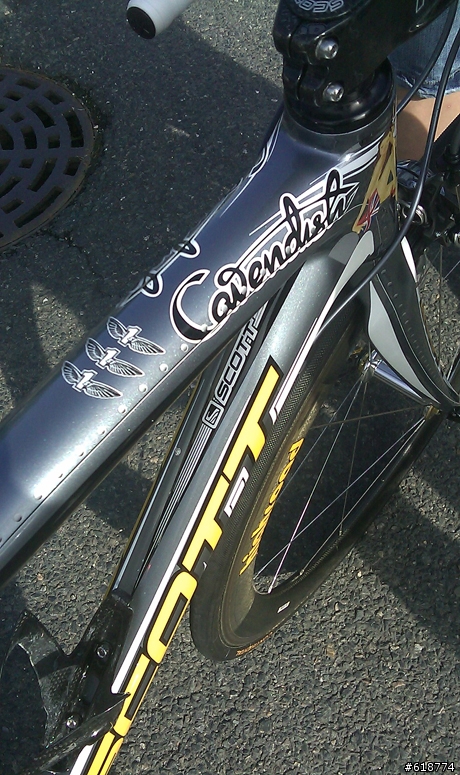 在Colimbia 的官網有解釋 :Canvendish 衝刺後擦綠色的眼鏡, 表示他強烈對爭取綠衫的企圖心.並希望能再多得幾站冠軍, 尤其是最後一戰香榭里舍大道那一戰.令人莞爾的是 : 在 SCOTT 專位他設計的 ADDICT 塗裝上,每得一戰單站冠軍, 就會有一張張開翅膀的冠軍貼紙, 蠻 Q 的 !!