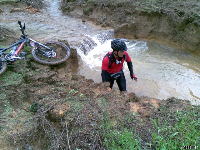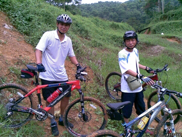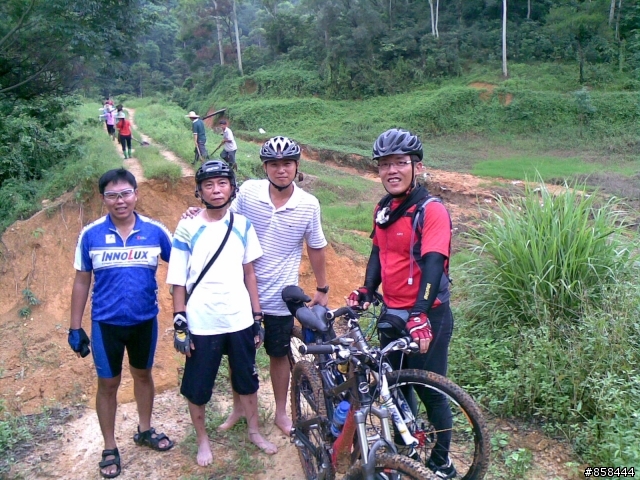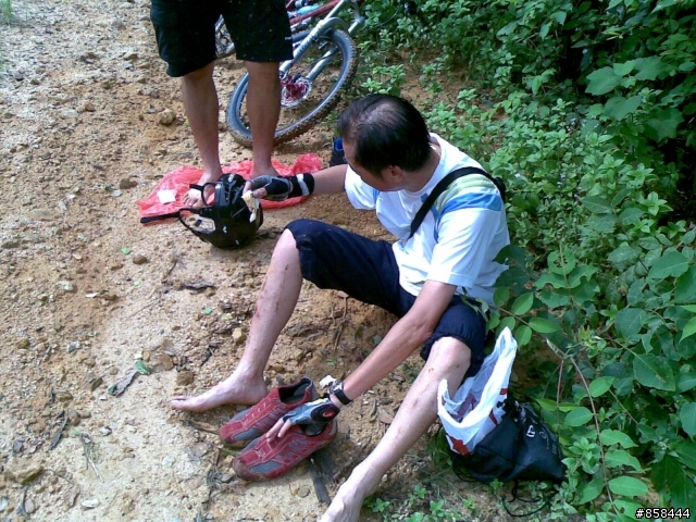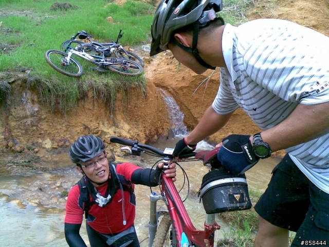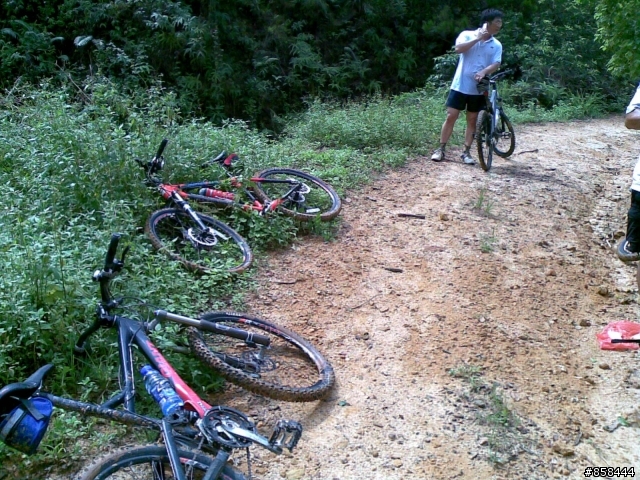 由於第一頁不移圖就無法編輯,將6/29的騎行照片放到這裏囉,看過的可以跳過,沒看過的就欣賞一下囉080629約騎東莞同沙水庫-松山湖照片此次行程為莞城沃爾瑪-同沙水庫-林道-松山湖全程六十公里,高步及厚街參加的車友全程應是八十公里早上天氣看起來還不錯,且車友們也都確認了參加意願,哪知早上在沃爾瑪集合時,突然下起了大雨,徵詢大家的意願,決定上刀山下油鍋都跟著我,除非是下刀子才取消,買了輕便式雨衣一人一件後就立刻出發了到了同沙水庫和小吳,洪先生會合後,才看見門口一張告示通知因連日大雨同沙水庫封園,開放日期待通知,天啊,我們都冒雨來了還遇到這種事,金害。不過小施已先溜進去等我們,所以我們也從不設防的特殊通道溜進去了會合後決定分兩條路到松山湖,一條是已開通未通車的松沙路,一條是傳統的off road路線,兩組人馬為公路組7人,土路組5人,因為這個選擇才有以下的圖片,以下就是我們土路組的照片路泥濘不堪也是意料中的事,大家也都有心理準備,不過這個就是始料未及的哇,我們的路怎麼不見了,而且還多出了一條小溪看來只能由這裏下去了,不過近四米的高度讓人心裏有些擔心正在大家還在猶豫到底要回頭還是給他渡過去時,我們的英雄洪哥已經跳下去了,看看洪哥的腳就知爛泥及膝,讓我們更是考慮再三這時小吳也跳下去了,這是陰謀,讓我們岸上的三個也沒辦法考慮過不過去了,洪哥扛著車往對岸去了,我們能不跟嗎洪哥:來啊來啊,我會接住你們的,不要害怕啦,最爛的路我都過了,腳也洗白了,快下來吧小吳也在下面準備接應我們的自行車,小吳和洪哥是今天最勇的兩個水還蠻深的,而且斷層的高度也很高,小吳在尋找良好地形讓我們可以比較安全輕鬆的過去先從這裏把車子用接力的方式運下去然後小吳幫我們把車子扛過去,洪哥在上方接應高步的隊長在擦腳穿鞋,像不像農民洗腳上田,如果被員工看到了一定會有很多說法的穿上鞋子襪子準備出發了看看剛才過來的地方,大家心裏都充滿了驕傲高步越野代表合照在斷路前合照加上我,就是我們五個人橫渡的,厲害吧不過在後面的公園工作人員眼中,這個是下雨後每天都要過的路,不知我們有什麼好爽的就是這條小溪把路沖斷的,聽車友說這次很多林道都被水沖壞了,上周去大嶺山公園要攻茶山頂也是一樣的情況這張照片很明顯可以看到路折斷的樣子人和車都是泥濘不堪,不過這也是off road最吸引人的地方騎行的獎品,松山湖凱悅自助餐我們的迷路天王,每條路都走十次,每次帶路都說沒問題,每次毫無意外的都迷路播收完畢,感謝大家的收看,謝謝