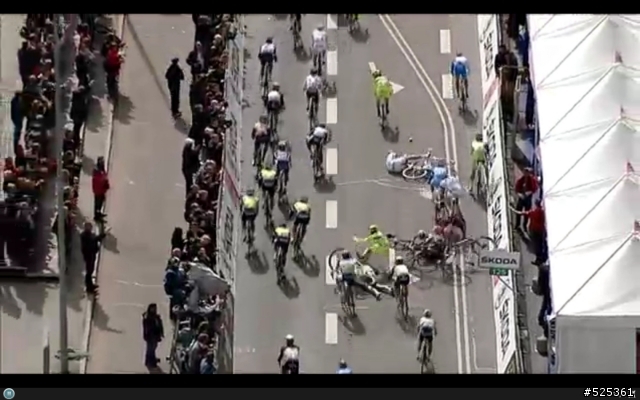 又摔了 @@ 拼的好兇 !!!粉紅衫遭受坡及, 盤子應該是摔車主角之一, 左肩衣服都破了,事後看起來是被撇輪掃到摔車這場 sky 失敗, 一開始列車都跑得很順, 也都頂在前頭結果 最後一公里半盤子竟然掉隊 @@sky 列車長頻頻回頭望, 最後放棄衝刺 @@greenedge M Goss 拿下單站 ~~ 果然前 htc 是衝刺車手的搖籃