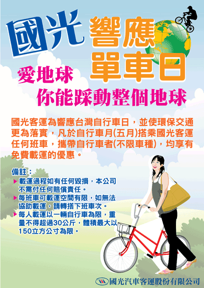 1.自行車請簡單包裝,載運過程如因碰損,國光客運不負賠償責任。