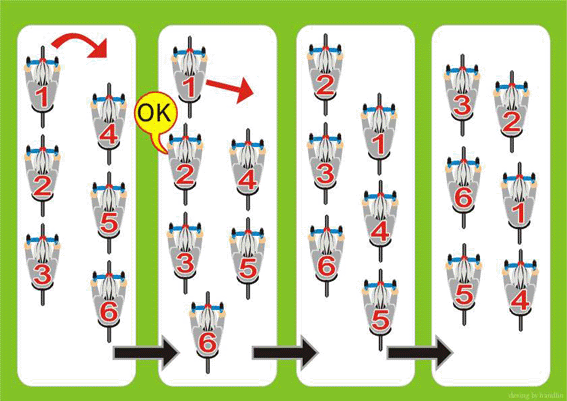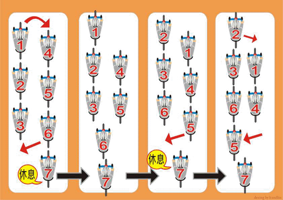 ,但是退下者也應於聽到口令時就開始加速,以利順暢地〝滑入〞頂風排最後