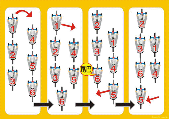 2.同樣道理,〝尾巴〞的口令,即避免退下的人在插回頂風排時不小心落後太