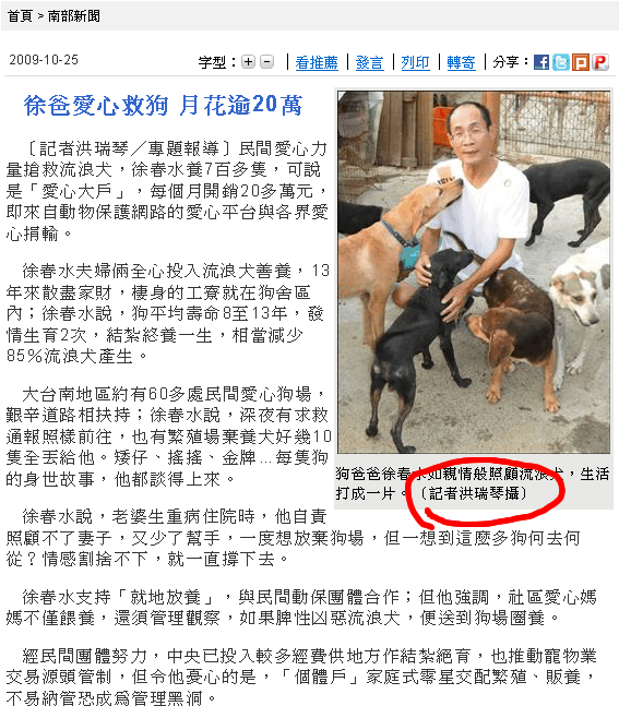 〔記者洪瑞琴/專題報導〕民間愛心力量搶救流浪犬,徐春水養7百多隻,可說是「愛心大戶」,每個月開銷20多萬元,即來自動物保護網路的愛心平台與各界愛心捐輸。