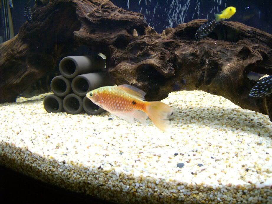 我也來分享一下我家的外星魚生命力超強破壞力超強放了甚麼都會被弄倒或是弄壞所以我的一尺缸現在只有這樣而且現在連過濾器都沒放了連過濾器都被他弄壞剩水跟小石子了他卻還是自由自在的那麼囂張話說當初買了七隻跟他一樣的魚六隻兩個月內全被他嗑掉剩他在缸裡活了七八年還是一樣勇健