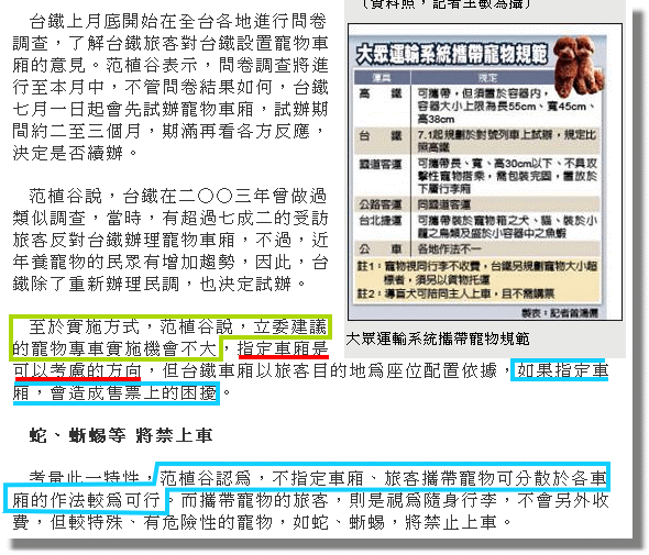 至於實施方式,范植谷說,立委建議的寵物專車實施機會不大,指定車廂是可以考慮的方向