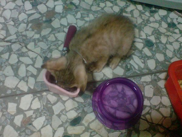 不過,現在改吃貓罐頭了,食量還算不錯了,活力還是很不好;但會用貓沙(我教的好辛苦)!