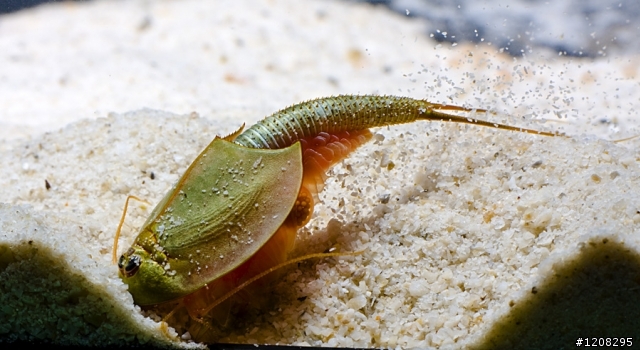 恐龍蝦產卵照片,可以清楚看到第11對附肢特化成的卵囊在背甲內側,恐龍蝦挖沙,卵正在釋放