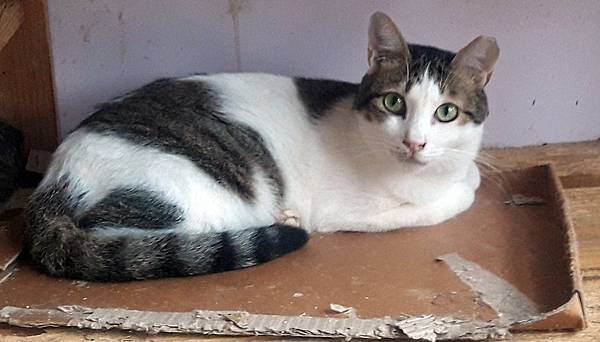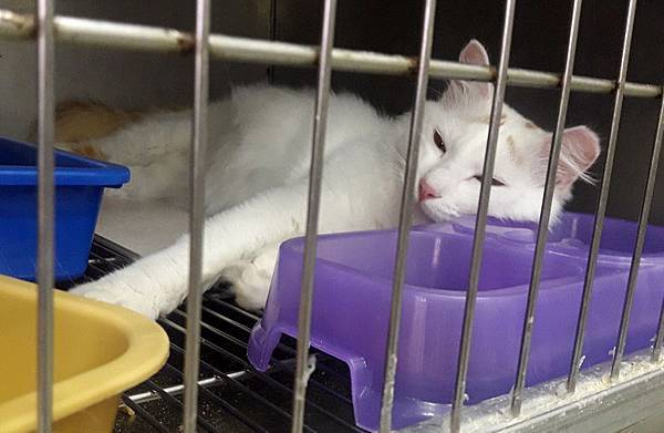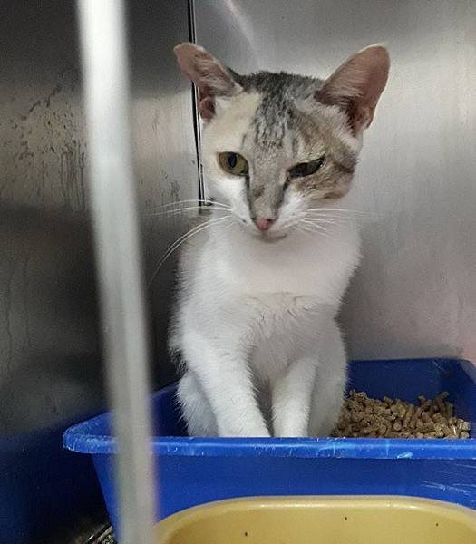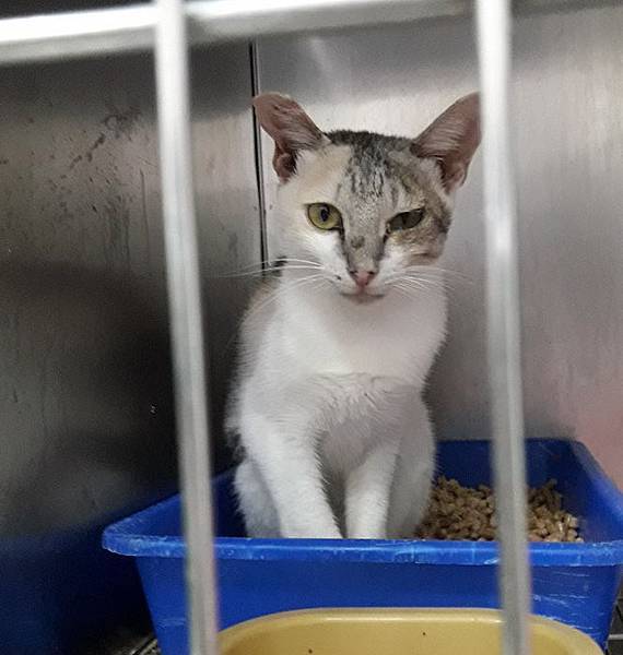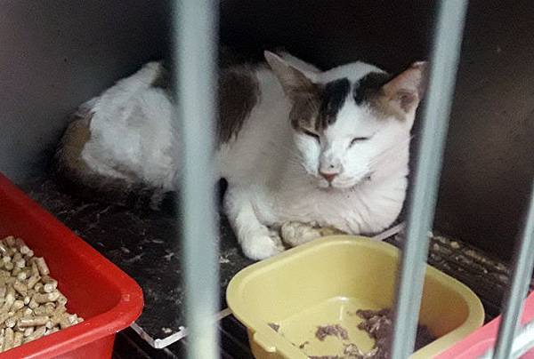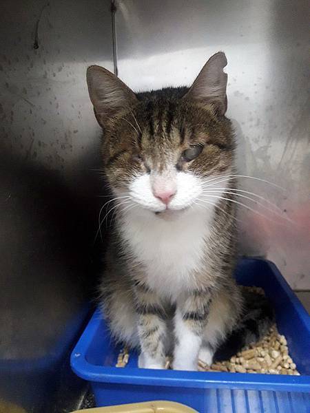 白底虎斑帥喵親人乖巧,目前進食困難,收容所環境不佳,傷口急需醫療救援與後續照護。