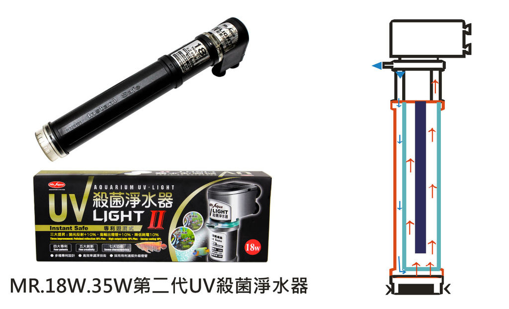 3·第二次再升級1又2分之1式回流設計其原理就是將1OO%淨化過的水1半流回魚缸1半經由流道再回到燈管做第二次的淨水處理,這個原理我們將他使用在35W及18W的產品上。