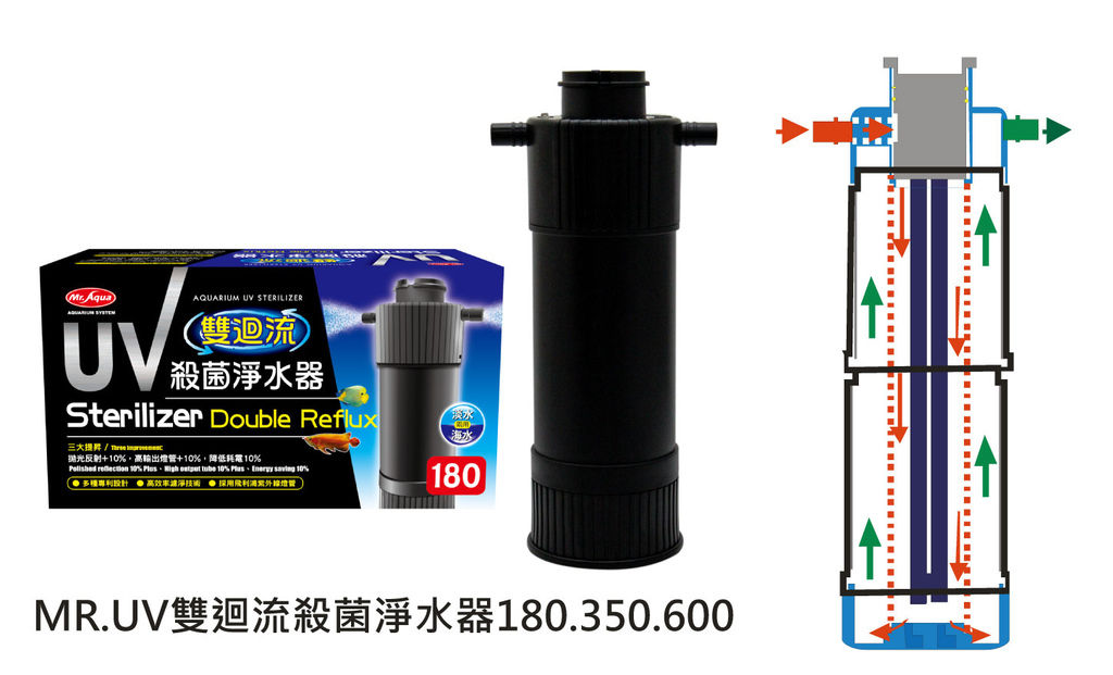 5.就是最新最高境界的雙迴流式(發明專利)這個設計最主要考量是讓消費者花最少的錢和最小的空間可以拿到最好的處理效果,就是我們實現的1加1等於2,原理將水流經石英導管内的6OW紫外線燈做第1次的處理,回流時水經石英套外和反射板間再1次的6OW淨水流回魚缸,1支等於2支的效果。