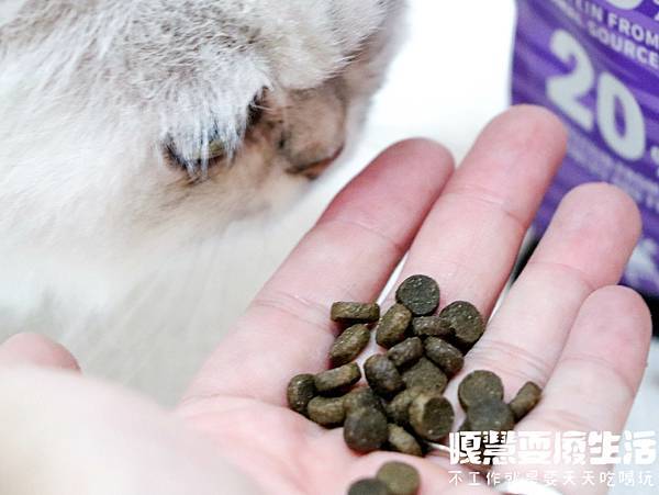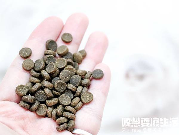 我習慣會從最底部抓起,重複確認飼料的品質,啾咪也會一起參與這個作業,飼料大小約直徑0.8公分,厚度0.2公分。飼料有兩種不一樣的顏色。是因為CHARM野性魅力使用了高含量的肉類,而且不使用人工色素或香料,所以顆粒顏色不會一模一樣,每一顆飼料裡都含有鮭魚及羊肉的高營養喔!啾咪整體蠻喜歡的,一直在偷吃我手上的飼料。啾咪給出的評價蠻高的。