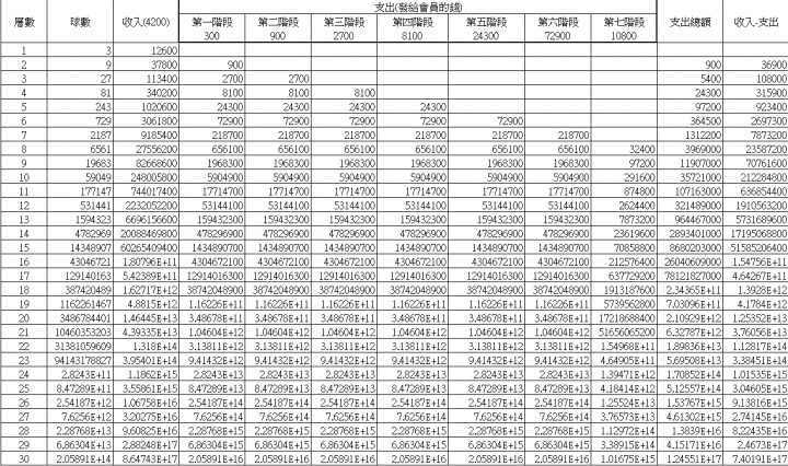 先聲明對於榮騰遊戲規則不是100%了解但是去看過各種網站說明的規則,自己做了一份試算表從試算表中得到的個人想法1. 對於榮騰公司來說,每一層都是賺錢的2. 公司是有收入的,收入來源來自於會員每個月貢獻4200?3. 會員真的能用4200換到12萬,只是越領越慢(等待過程中的支出4200*N月,可能讓你為了領12萬花得更多)4. 對於榮騰公司來說這是可以永續經營的(只要會員不離不棄每個月固定貢獻4200)
