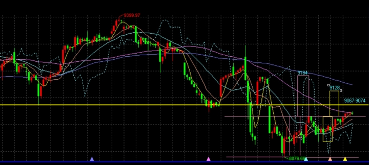 今天一腳收在踏進空方修正的門檻上,明天這個門檻降低到8973-8985,如果可以站穩,反彈波就可以延伸,至於可以走到哪,還是那句老話,等遇壓收黑訊號出來再說,目前空方背景持續,但指標開始在低檔有交叉的趨勢,如果再拉一根紅K,短底成形的機會就高了,預估可能的壓力點會在9140附近,只是如果真的到這裡,指標的低檔交叉成形,似乎又預告著還可以往上走,這部分我們不去預設立場,到時候再依多空的力道消長做判斷