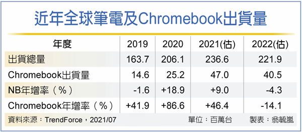 至於台品牌廠宏碁,直至今年上半年的Chromebook機款出貨比重,仍占達其整體筆電出貨的五成之高,下半年在教育出貨需求走緩後,受到的影響亦較明顯。