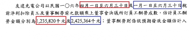 福利費用 單季 有時 7 ~ 8億多,裡面一部分可能 含季獎金,員工信託持股補貼,每季淨利5%~10% 當員工酬勞.... ,中秋,端午加發半個月獎金,可能不是含在員工福利費用這項裡,因為 半個月薪水,相當於 1/6的季度薪水,高達10~15億,可能是和加班費,一起算在薪資費用裡.今年公司 稅前淨利 超過4百億,第一季編列 10%,11億員工酬勞,第二季編列12億員工酬勞,上半年合計24億員工酬勞,今年全年可能編列高達 "稅前"淨利的10%, 44億員工酬勞,.明年留任的員工福利 分紅獎金可能不少?