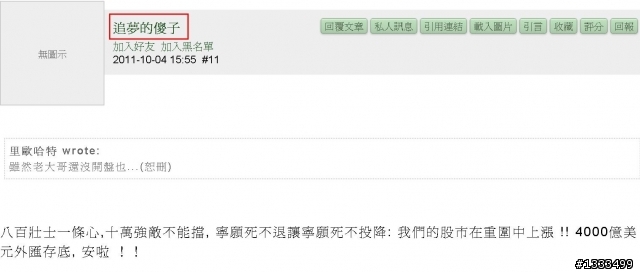 里歐哈特 wrote:雖然老大哥還沒開盤也...(恕刪) 八百壯士一條心,十萬強敵不能擋, 寧願死不退讓寧願死不投降: 我們的股市在重圍中上漲上漲上漲上漲上漲上漲上漲上漲上漲 !! 4000億美元外匯存底, 安啦 !!