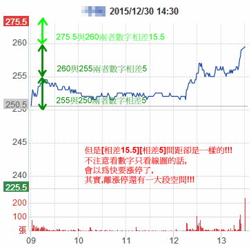 又過了一個多禮拜還是沒修正縱軸的數字始終比例尺不一以下圖為例:--------------------275.5與260兩者數字相差15.5260與255兩者數字相差5255與250兩者數字相差5但是[相差15.5][相差5]間距卻是一樣的!!!不注意看數字只看線圖的話,會以為快要漲停了,其實,離漲停還有一大段空間!!!---------------------很容易在投資上影響判斷............修正這個地方應該不難才對啊..........ps:以上圖形取材自奇摩股市並加以註解說明, 並無侵權的用意, 若有任何版權的問題, 請告知, 會刪除此文件的, 謝謝!gene0422 wrote:縱軸的數字(股價)...(恕刪)