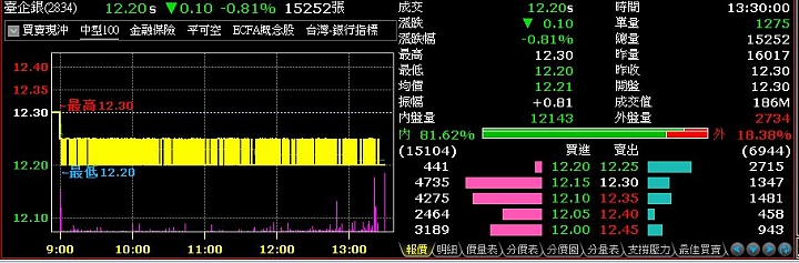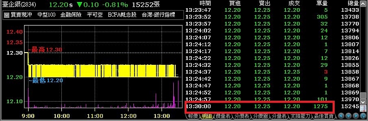 **小螞蟻 worte:來經驗分享一下!像這...(恕刪) 分享二:像臺企銀今天收在最低點,可以利用最後一盤的五分鐘撮合,先把價位打好準備送出,大概在最後五秒看撮合價落在哪裡,然後送出確認,只要價格比別人高,就有很大機率成交在最後看到的撮合價唷
