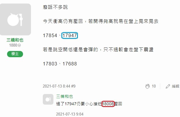 f890603wrote:樓主目標價18XXX有變嗎? 還請夢到時開釋眾生 為何大大一直拘泥於18459這點呢?6月初發那篇PO文是認為大盤有可能6月達標萬八夠強的話還有機會到18459附近,所以那篇PO文才列出來但到6月底還差200出頭才有達標,進入7月就不用管這個點因為時間不同了,空間也會不一樣