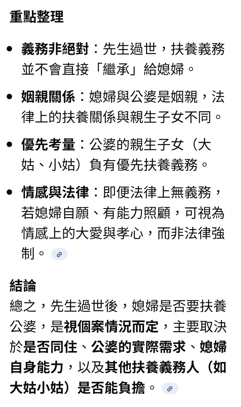 大俠漢寶寶 wrote:一個婦人未和先生離婚...(恕刪) 這位婦人該擔心的是她先生的遺産能否拿到,怎會打到婆婆的財產歪腦筋,繼承的4個順位,媳婦都沒有,除非婆婆有立遺矚,像陳松勇給看護400萬,但媳婦離家多年是不可能有的,看先生在生前有沒因這婦人離家出走時立遺矚,不給