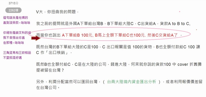而且你第二,三,四段都作一個很蠢的假設,沒有人這麼做"三角貿易"!