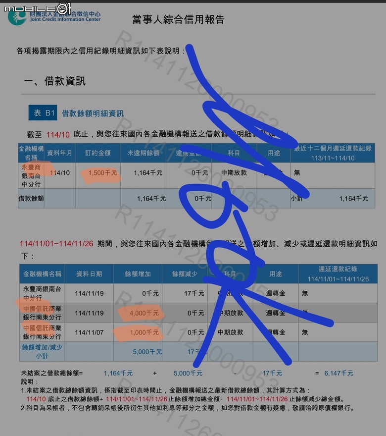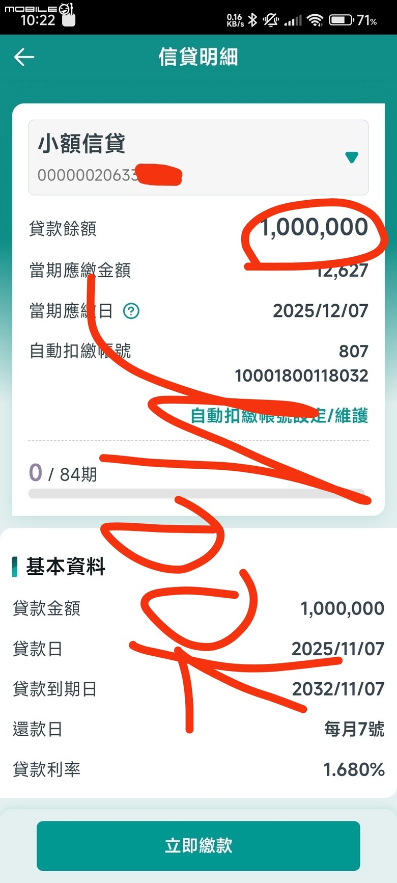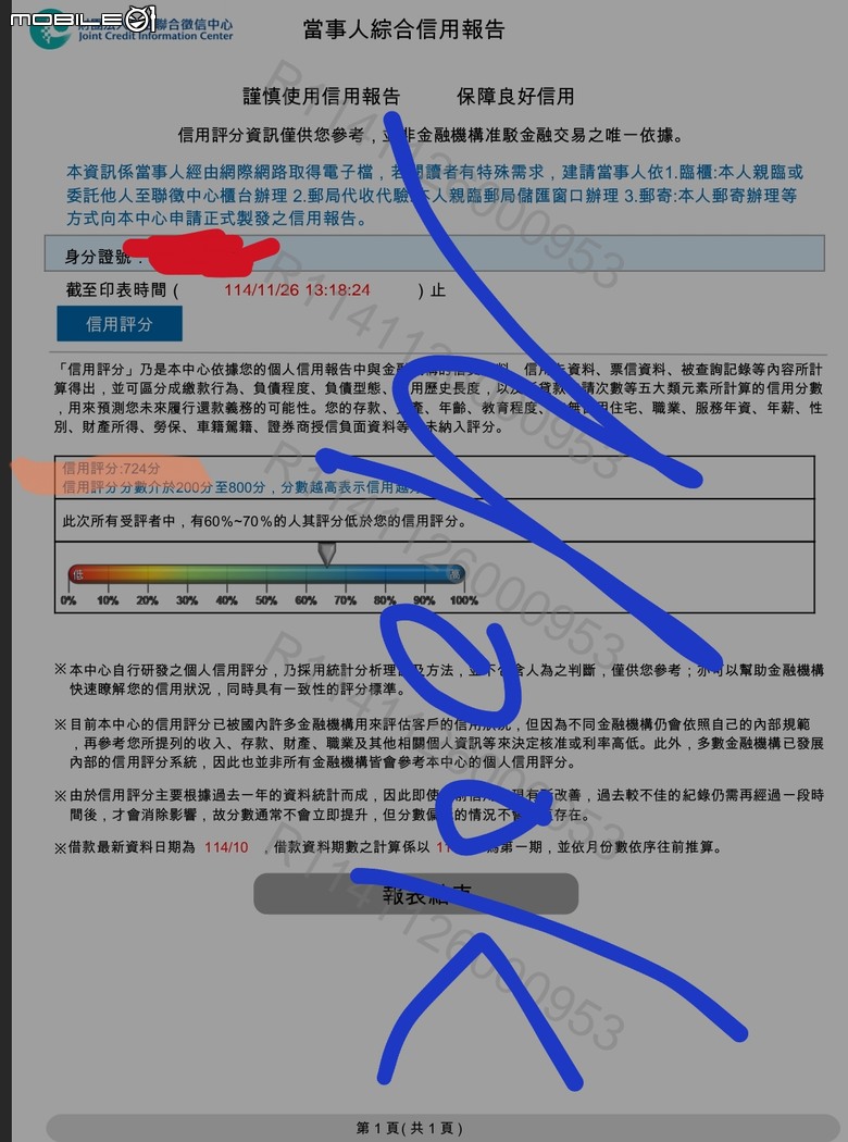 M013782989 wrote:每年聯徵中心...(恕刪) 我發這篇文章的重點是什麼?我只能說內行看門道,外行看熱鬧而已,重點是分數嗎?如果是的話,只能說你還太嫩了,聯徵報告的重點是在於你是否有主從債務,信用是否有異常,我聯徵的重點是,我名下沒有任何債務,長期擔保放款0中期放款0短期擔保放款0這就是我跟大部分的人不一樣的地方,剛收到的地價稅約繳5萬元。你真的有看懂嗎?
