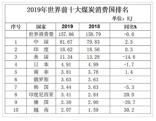 2019年,全球煤炭消費總量為157.86EJ,比上年下降0.6%,這是六年來第四次下降,煤炭在全球一次能源中的比重下降到27.0%,為16年來的最低水平。煤炭消費量排名前十位的國家分別是:中國、印度、美國、日本、南非、俄羅斯、韓國、印度尼西亞、德國和越南。除中、印、美、日四大煤炭消費國排序不變外,第5到10位排名位次均發生變化。其中越南超越波蘭成為第10大煤炭消費國。世界前十大煤炭消費國中,亞洲獨占6席。2019年,中國煤炭消費量佔全球總消費量的51.7%,比上年提高1.4個百分點。